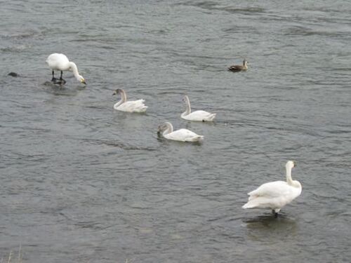 日曜日の夕方、千曲川に行ってみたらコハクチョウがいました。成鳥が12羽、首が灰色がかった幼鳥が5羽。一緒にマガモとカルガモが2羽ずついました。 風が強く、寒かったせいか人はほとんどいませんでした。あるいはそろそろ飽きたのか。 近所の池では見かけ…